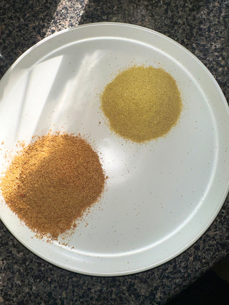 The red blend is rich, bold, and smoky — it’s what gives that hint of warmth to chicken, seafood, or any sauce that needs depth. Think of it as my “soulful kick” seasoning. I use this on the most, hands down.